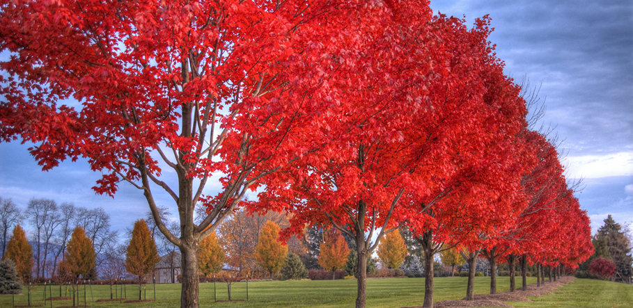 加拿大有一条枫叶大道,遍布美国红枫如秋火焰、夕阳红枫、十月光辉、红点红枫、秋日烈焰等。它东起魁北克省,西至尼亚加拉大瀑布,全长大约800公里。